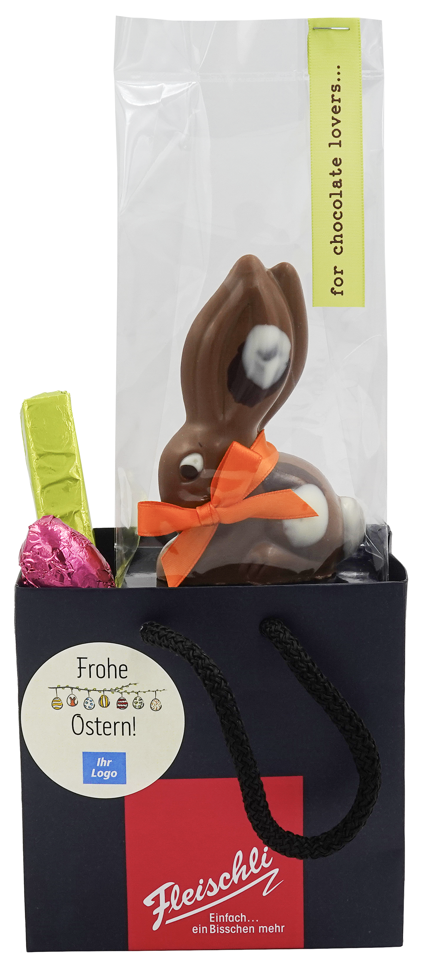 Die Geschenktasche enthält:Osterhase Flöckli (1 Stk.)Branchli (1 Stk.)Praliné-Eili Gianduja-Haselnuss (1 Stk.)