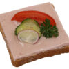 Toastbrot aus Schweizer Mehl mit Thonfüllung (Westpazifischer Ozean). Mit Salatgurken, Mayonnaise, Petersilie und Radieschen garniert und mit veganem Sulz glasiert.