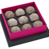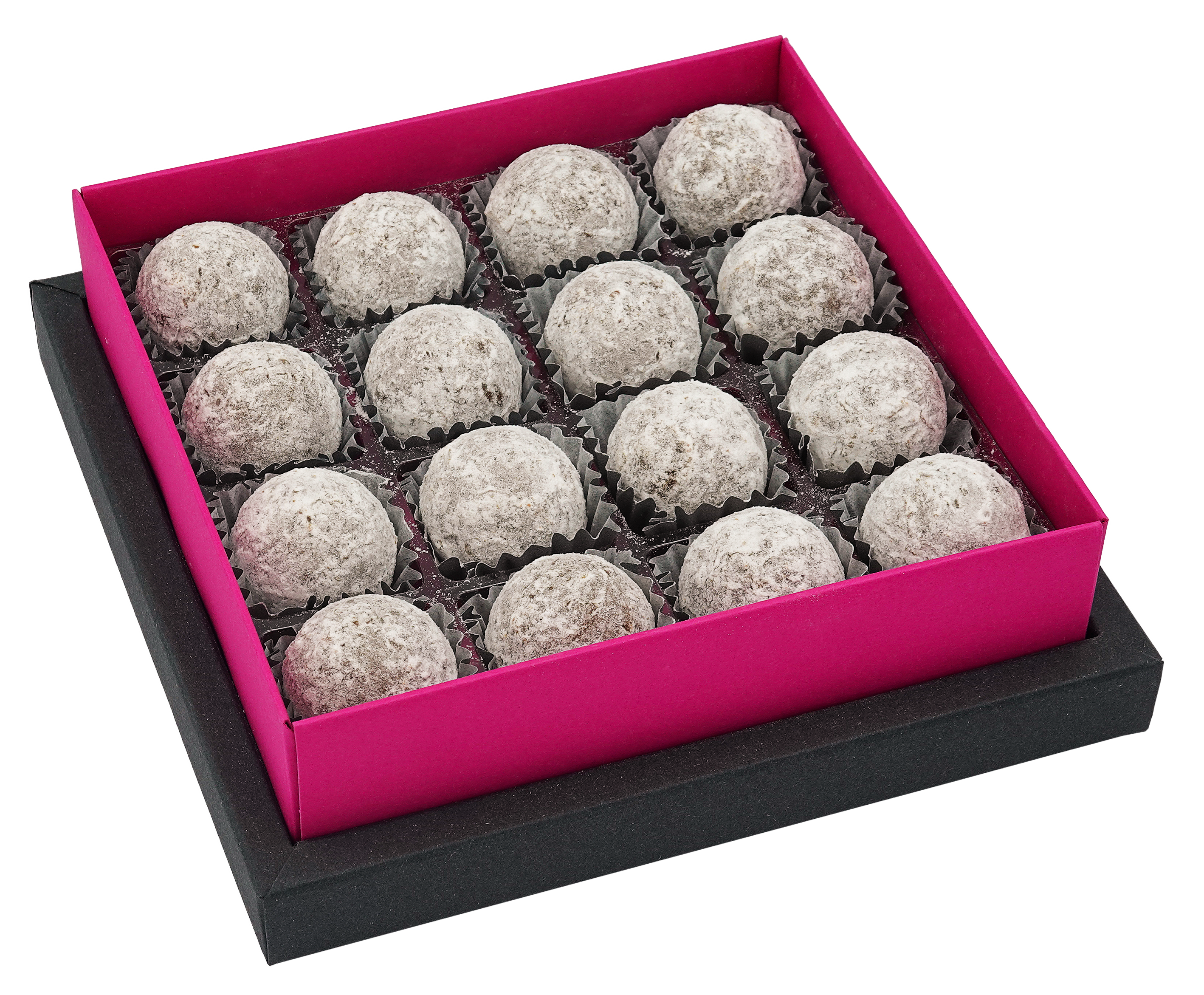 Luxuriöse Truffes, gefüllt mit cremiger Champagner-Ganache, umhüllt von zarter Schokolade und veredelt mit einem Hauch von Puderzucker.