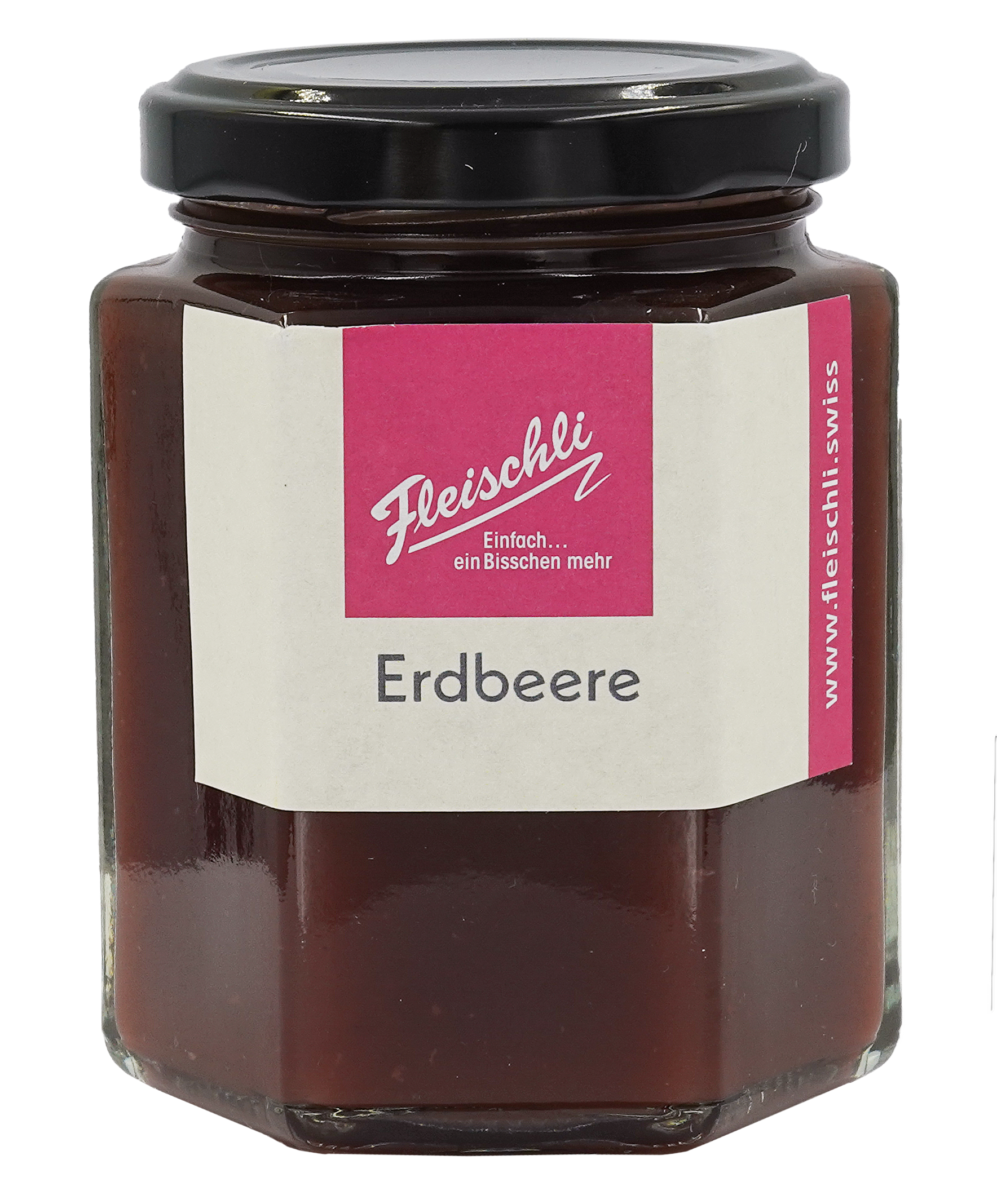 Hausgemachte Erdbeerenkonfitüre aus ganzen Erdbeeren und Zucker aus der Schweiz.