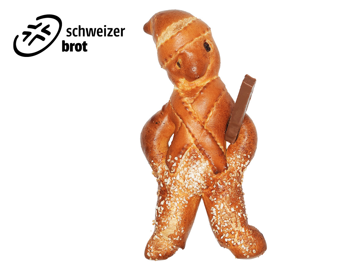 Luftiger Hefesüssteig in der traditionellen Form des Grittibänzen gebacken. Klassisch dekoriert mit Hagelzucker und Rosinen als Augen. Der Grittibänz wird durch das hausgemachte Schoggistängeli vollendet.