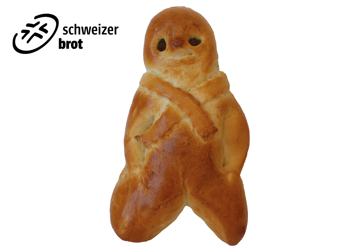 Luftiger Hefesüssteig in der traditionellen Form des Grittibänzen gebacken. Dekoriert mit Rosinen als Augen.