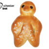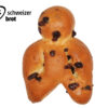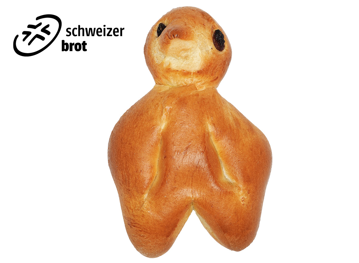 Luftiger Hefesüssteig in der traditionellen Form des Grittibänzen gebacken. Dekoriert mit Rosinen als Augen.