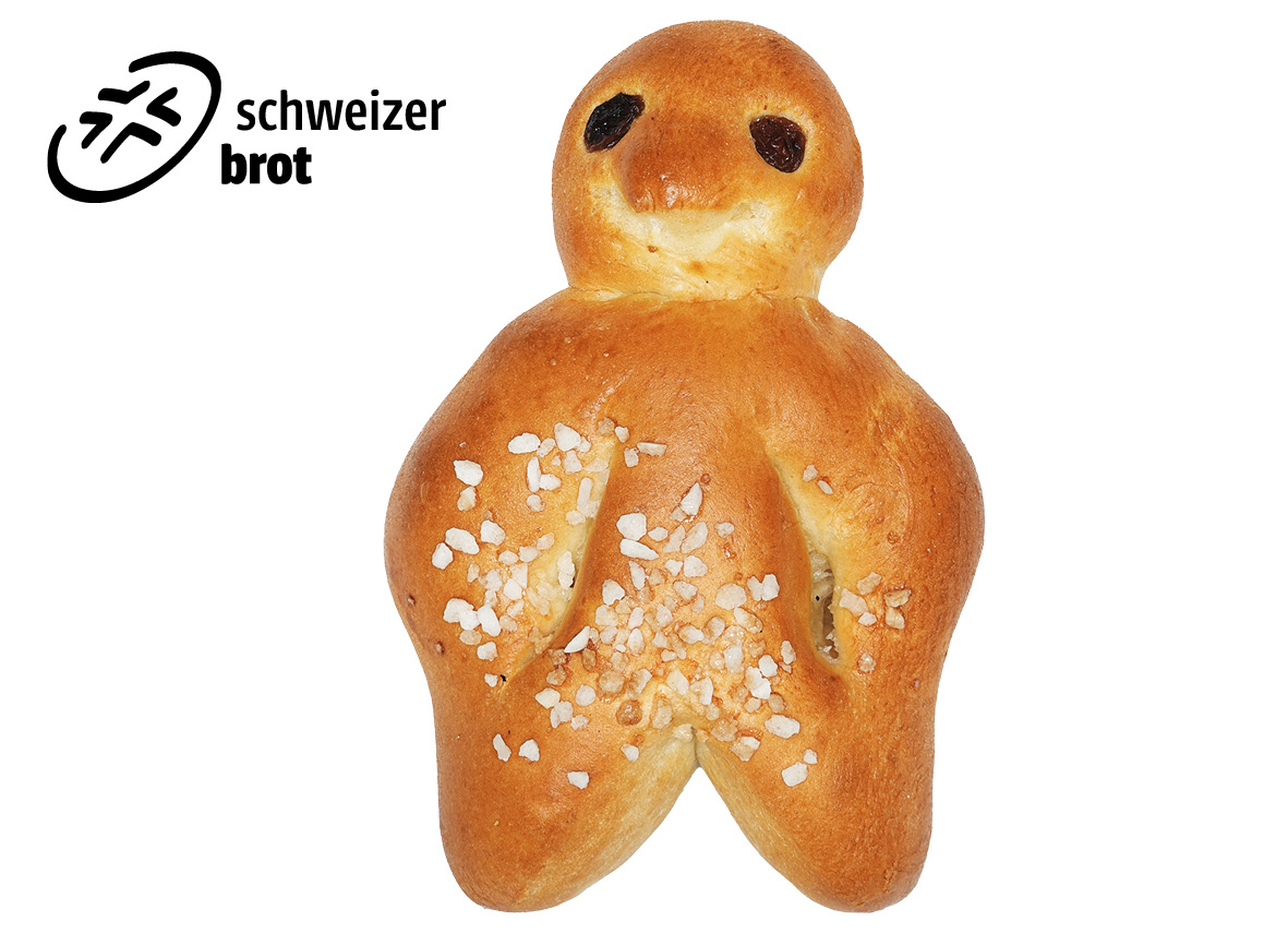 Luftiger Hefesüssteig in der traditionellen Form des Grittibänzen gebacken. Klassisch dekoriert mit Hagelzucker und Rosinen als Augen.