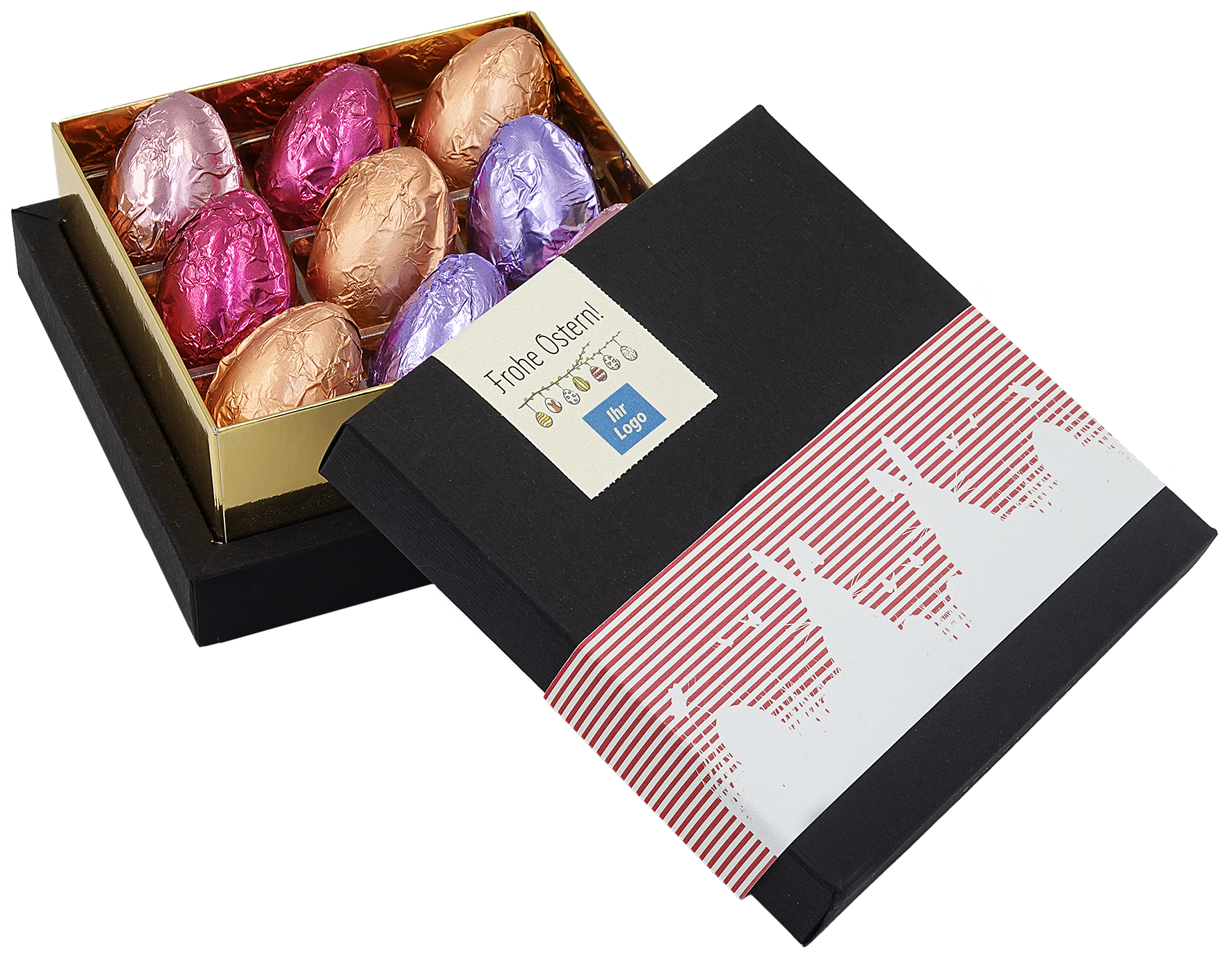 Feinste hausgemachte Praliné-Eier, in den vorzüglichen Varianten Gianduja/Haselnuss, Caramel-Brûlée sowie Eiercognac und Baileys.