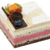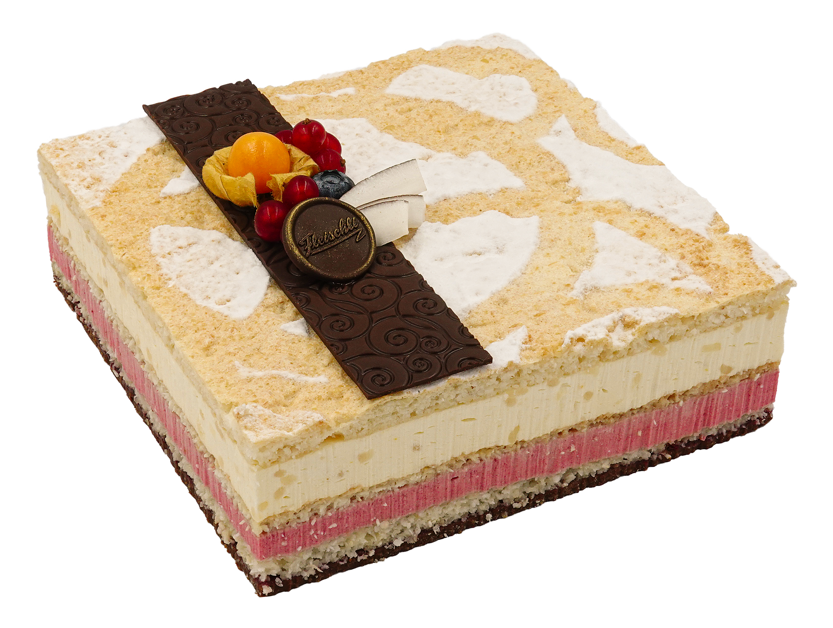 VOLLRAHM CH, Himbeerpüree (11.0 %), Zucker, Milchreis (MILCH, Reis 11%, Zucker, Salz, Aromen), HASELNÜSSE, EIWEISS CH, Couverture dunkel (Kakaokerne, Zucker, Kakaobutter, Vanille) Kakao mind. 65%, Wasser, Früchtemix saisonal variabel (Physalis, Erd-, Him-, Blau-, Johannisbeeren), Kokosnusspuree (2.3 %), Couverture Weiss (Zucker, Kakaobutter, MILCHPULVER, Emulgator SOJALECITHIN, Vanille-Extrakt) Kakao mind. 36%, Puderschnee (Puderzucker, WEIZENSTÄRKE, Palmfett ungehärtet, Palmfett gehärtet), Kokosnuss (2.3 %), MANDELN, Backmarmelade Himbeer (Zucker, Glukosesirup, Himbeeren 22,7%, Wasser, Himbeerkerne, Geliermittel E440, Säuerungsmittel E330, Säureregulator E331, Sonnenblumenöl, Holundersaftkonzentrat, Konservierungsmittel E202, Aroma), EIGELB CH, JOGHURT, Speisegelatine (Schwein), WEISSMEHL (WEIZENMEHL, WEIZENGLUTEN, GERSTENMALZMEHL, Mehlbehandlungsmittel E300), Rapsöl
