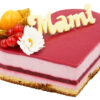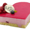 Luftiges Himbeerquarkpatisserie mit einem fruchtigen Himbeerspiegel auf einem hausgemachten Mandelbiskuit.