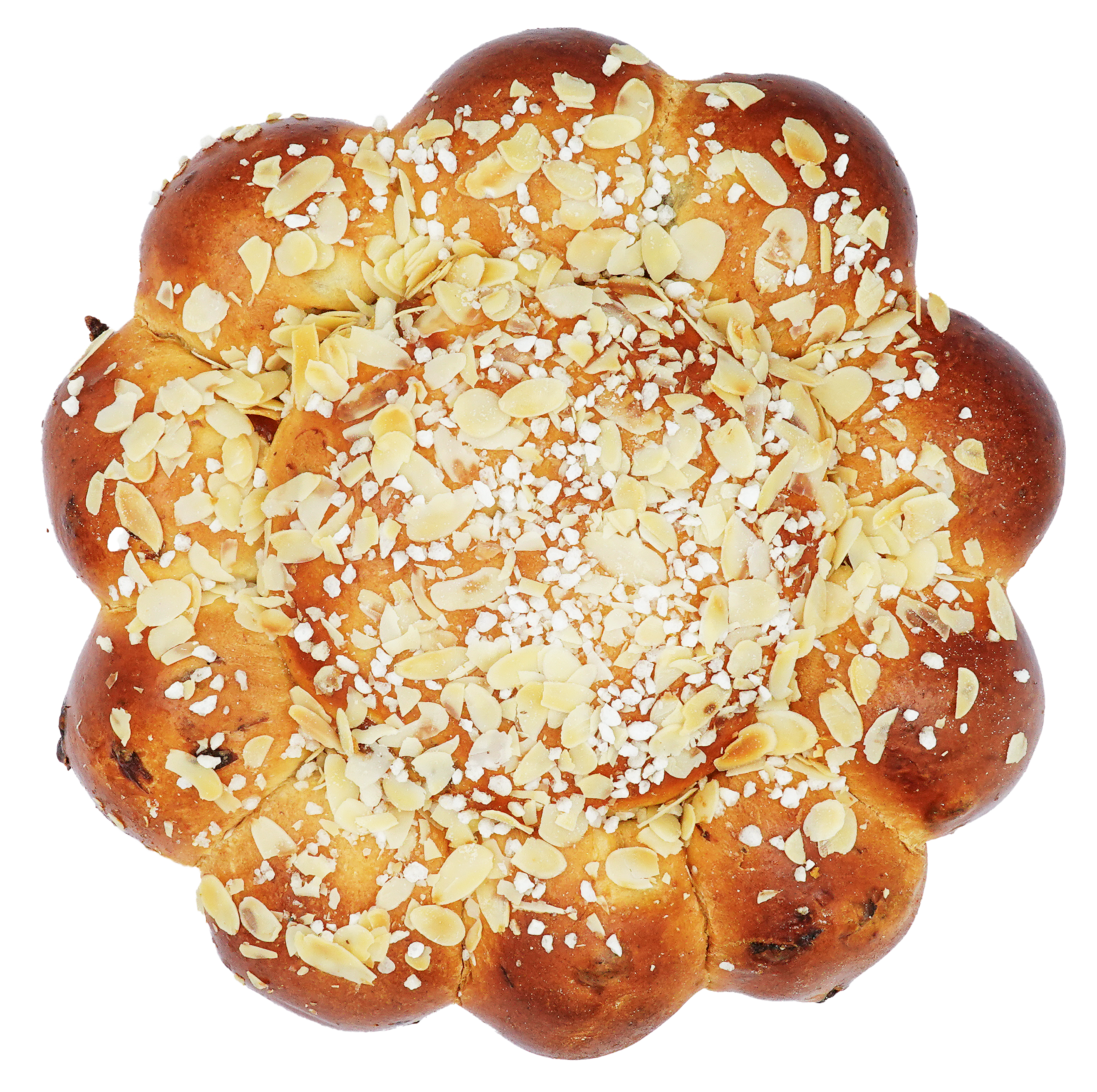 Luftiger Hefesüssteig mit Butter, Mandelmasse und saftigen Sultaninen verfeinert. Garniert mit gehobelten Mandeln und Hagelzucker.