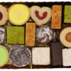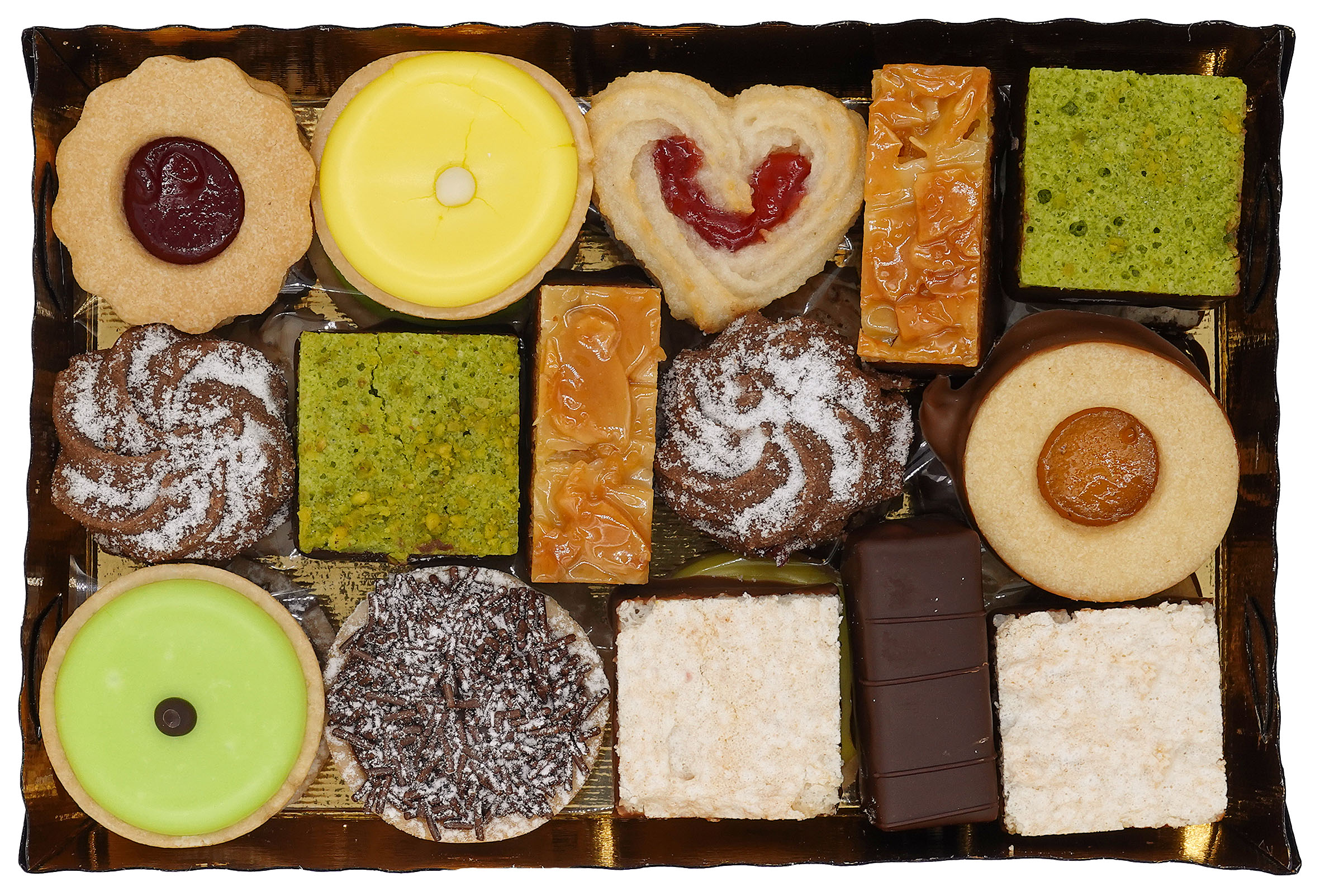 Couverture (Zucker, Kakaobutter, Kakaomasse, Milch- und RAHMPULVER, Emulgator SOJALEZITHIN, Vanille), Zucker, WEIZENMEHL, BUTTER CH, Himbeer-, und Aprikosenmarmelade, Zuckerteigbödeli (WEIZENMEHL, Zucker, Palmöl, BUTTER CH, MAGERMILCHPULVER, Emulgator SOJALECITHIN, Speisesalz), MANDELN, VOLLRAHM CH, VOLLEI CH, EIWEISS CH, Erdbeergelée, Kokosnuss, Kokosfett gehärtet, Glucose, Backmasse (SOJA, MANDELN, Aroma), Financiermasse (Zucker, MANDELN, EIWEISS, BUTTER, WEIZENMEHL), Rum, Cognac, Wasser, Zitronen (SULFITE), fettarmes Kakaopulver, EIGELB CH, Überzugsmittel Gummi arabicum, HASELNÜSSE, Dekoperlen (mit MILCH, SOJA, WEIZEN, Farbstoffe (E174, E120), Glanzmittel E904, Rindergelatine), Feuchthaltemittel (E420, E422), löslicher Kaffee, Haselnussmasse (Zucker, HASELNÜSSE 25%, Wasser, SOJA, Reisstärke, Caramel, Zitronenraspel, Konservierungsmittel (E200, E330), Zimt), PISTAZIEN, Aromen, Alpensalz, Vanillearoma (enthält Ethanol), Backtriebmittel (E341, E450, E500, E503, E504), Gewürze (SULFITE), Vanillinzucker, Farbstoffe (E102, E104, E120, E131), Konservierungsmittel (E200, E202)