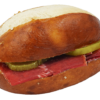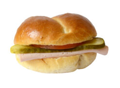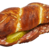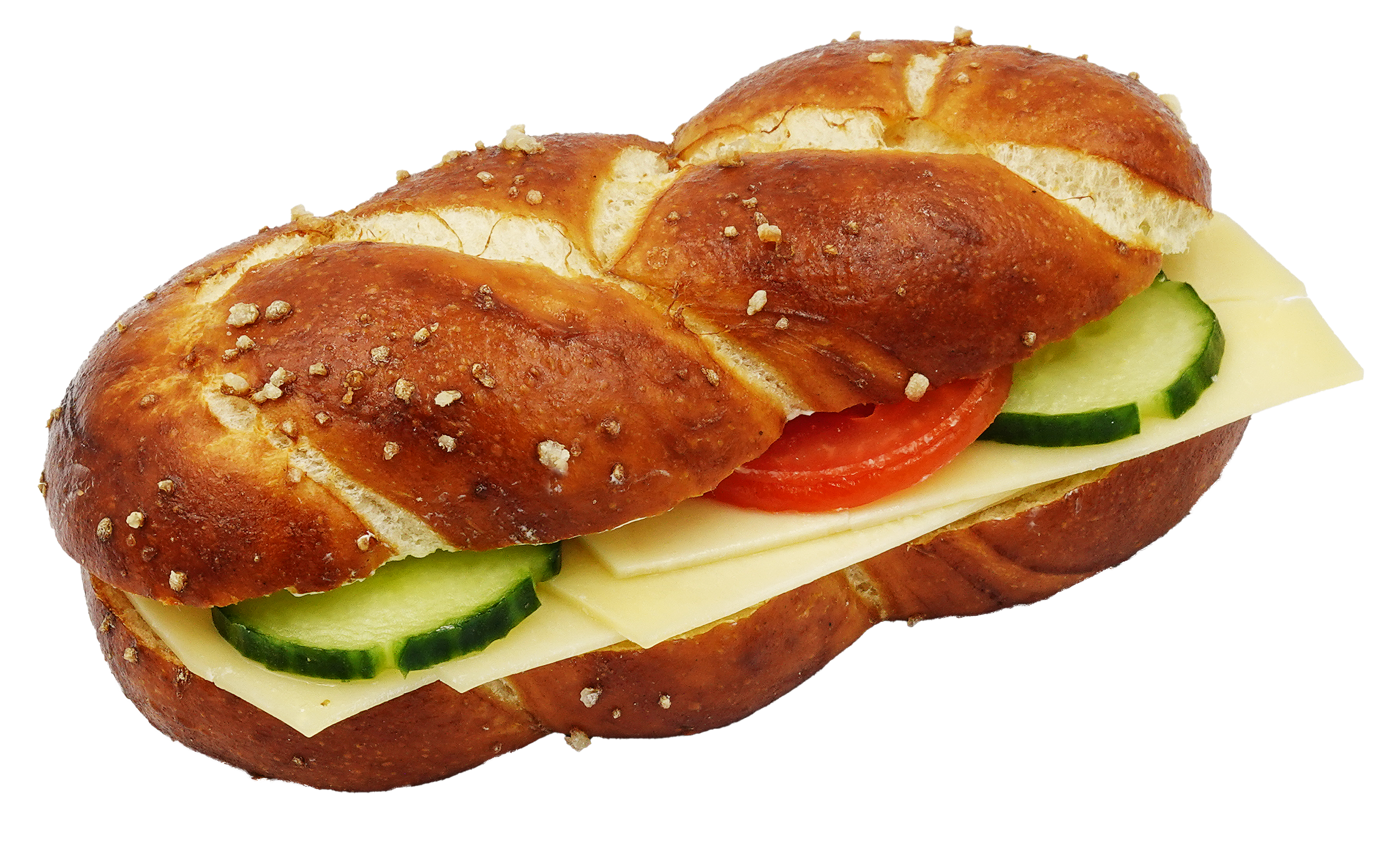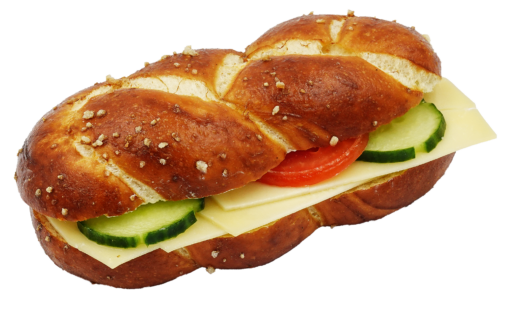 Luftiges Laugenzöpfli, gefüllt mit Gruyère und garniert mit Gurken- und Tomatenscheibe.
