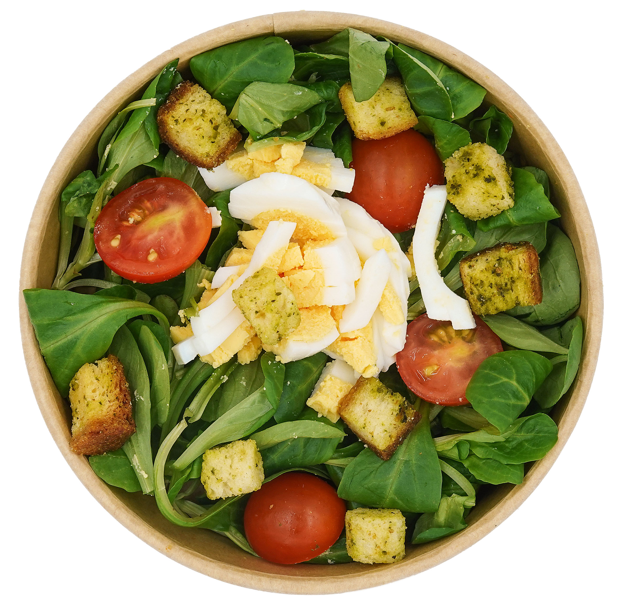 Erntefrischer Nüsslisalat, mit schweizer Ei, Cherry-Tomaten und hausgemachten Pesto-Croutons.