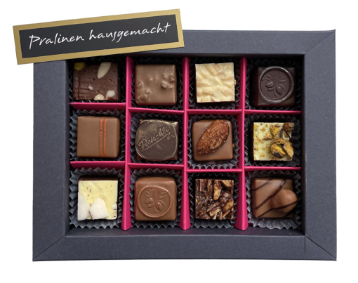 Hausgemachte Pralinés, erhältlich in den Sorten: Café, Pistazien-Marzipan, Rocher Weiss, Praliné-Vanille, Praliné-Milch, Rocher Milch, Nougat Montelimar, Mandel-Gianduja, Haselnuss-Gianduja, Noci, Caramel und Kokos-Gianduja.
