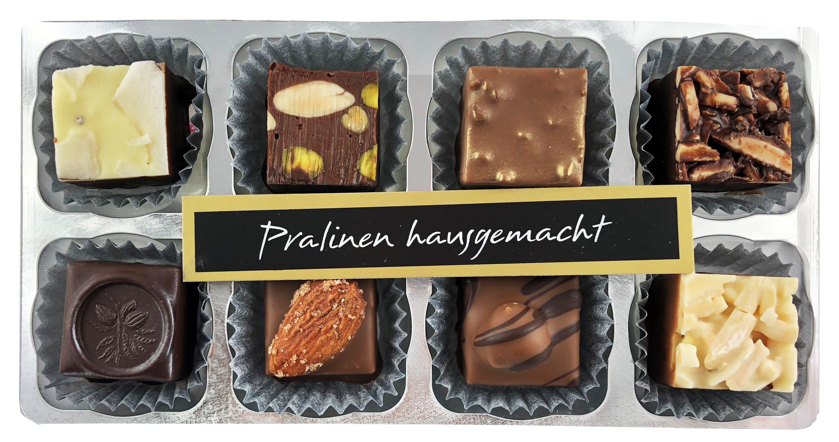 Hausgemachte Pralinés, erhältlich in den Sorten: Café, Pistazien-Marzipan, Rocher Weiss, Praliné-Vanille, Praliné-Milch, Rocher Milch, Nougat Montelimar, Mandel-Gianduja, Haselnuss-Gianduja, Noci, Caramel und Kokos-Gianduja.