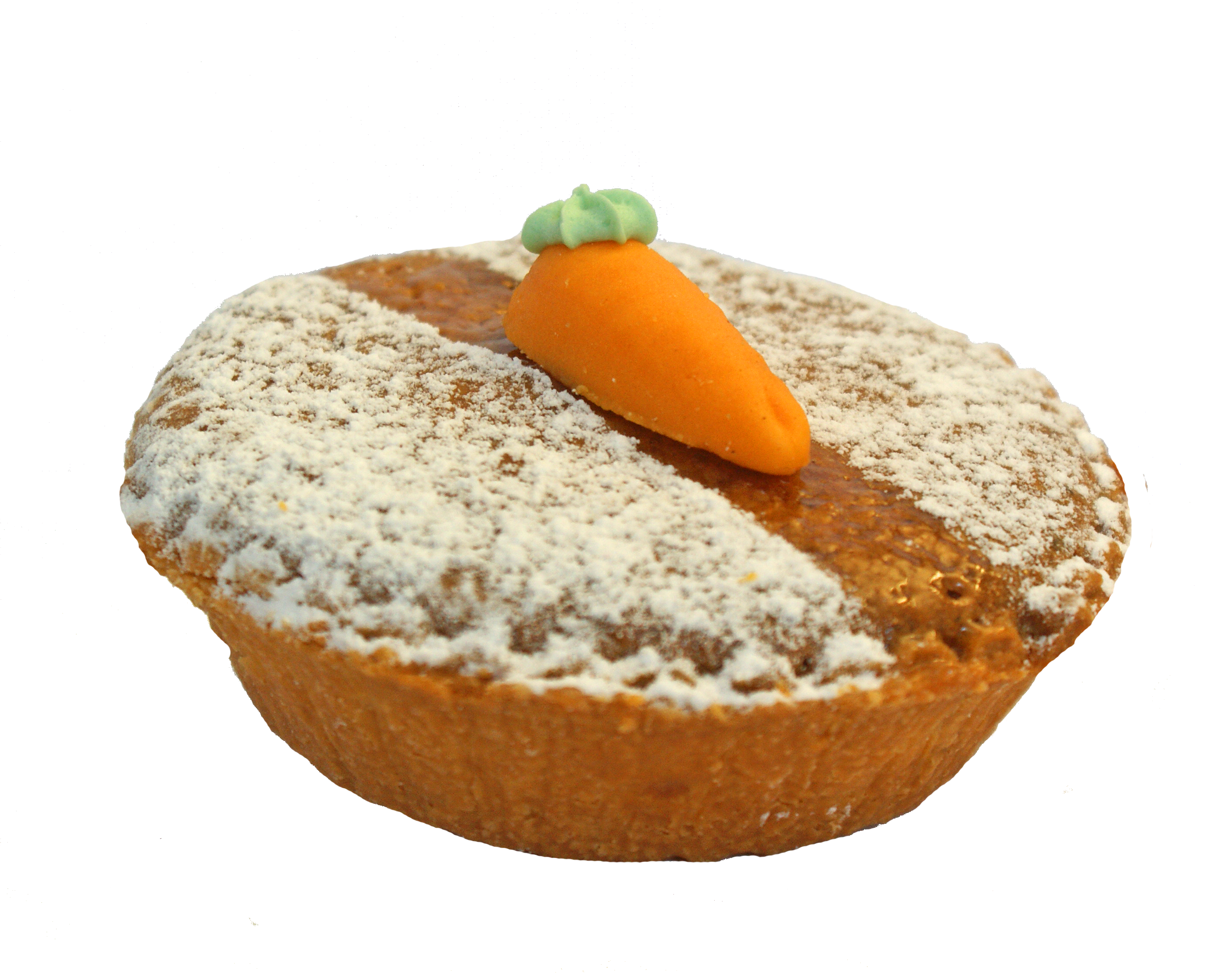 Knuspriger Mürbeteig mit Rüebli-Mandelbisquit und Marzipanrüebli.