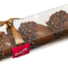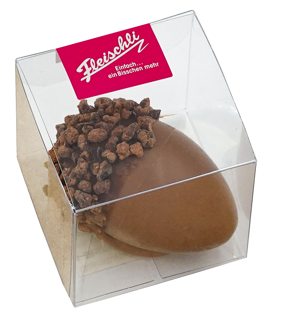 Feine Mandel-Gianduja, überzogen mit zarter Milchcouvertüre und dekoriert mit knusprigen Kakao-Nibs.