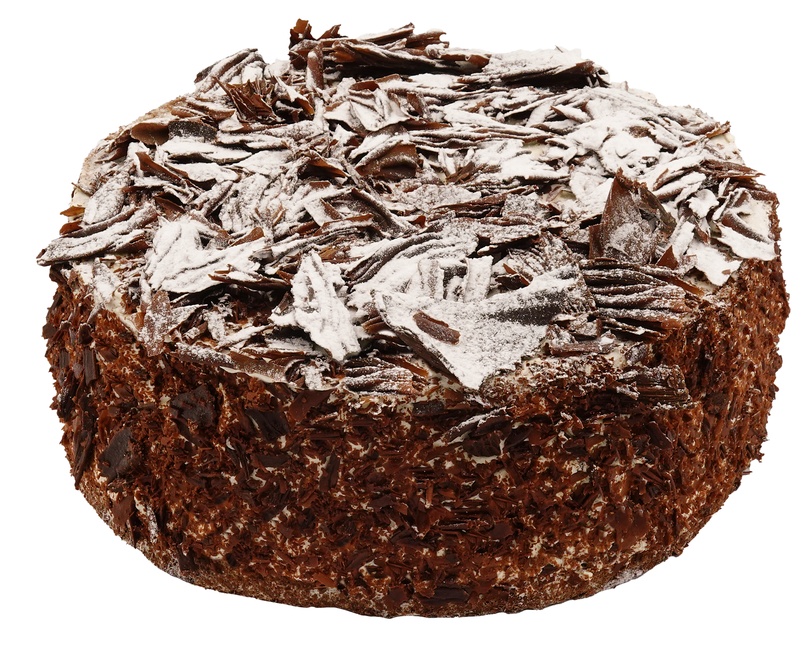 Für 2 bis 4 Personen. Dunkles Schokoladenbisquit, leichter Rahm, umhüllt mit Couverturespäne. Ohne Kirsch (Alkohol) und Kirschen (Frucht).