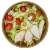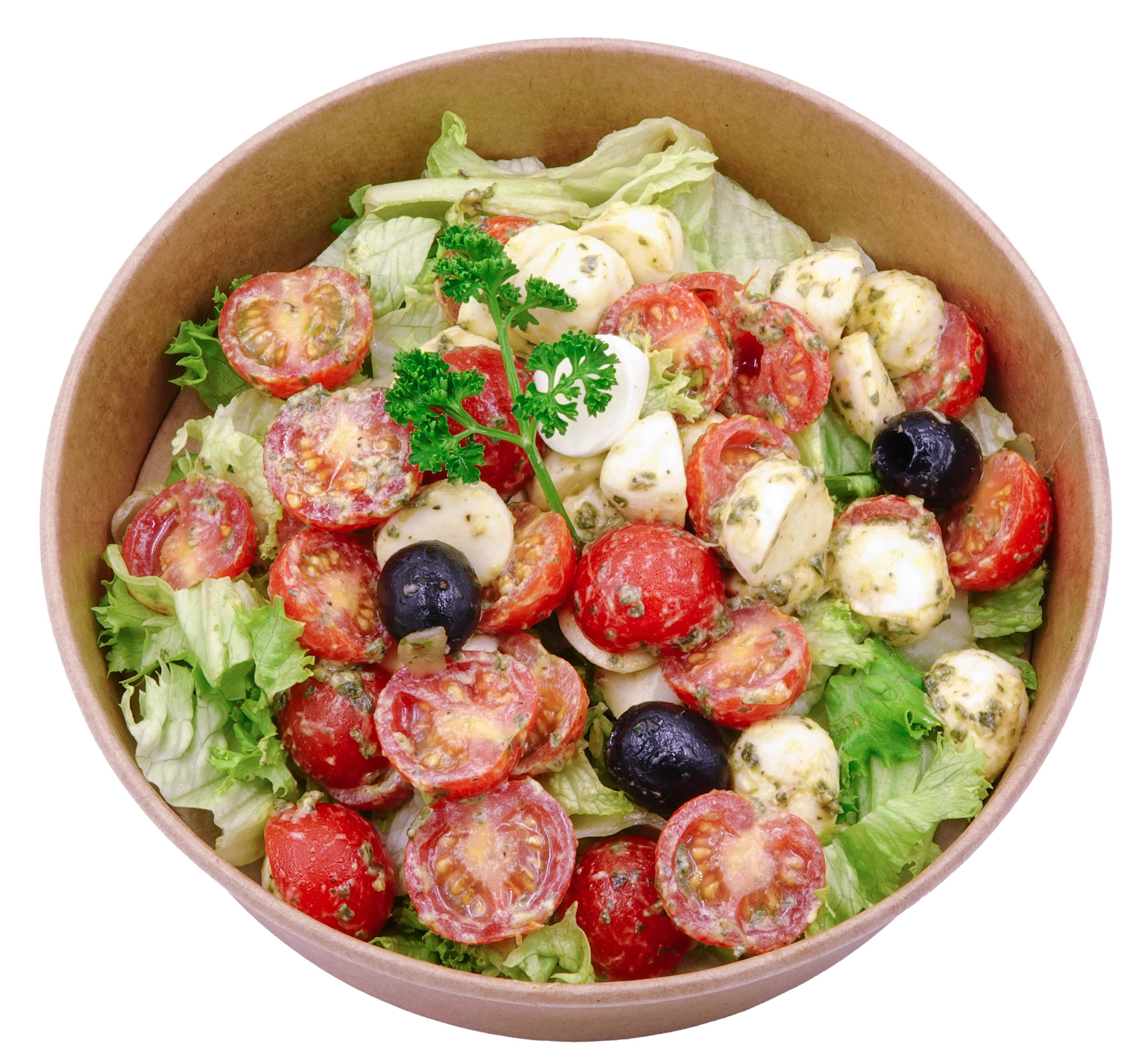 Tomaten (46.7 %), MOZZARELLA (MILCH CH pasteurisiert, Kochsalz) (32.3 %), Eichblattsalat (14.4 %), Rapsöl, Schwarze Oliven (Oliven, Speisesalz, Stabilisator E579), Basilikum frisch (1.1 %), Sbrinz-Käse (MILCH, tierisches Lab, Milchsäurebakterien, Speisesalz), PINIENKERNE, Knoblauch, Alpensalz, Pfeffer schwarz