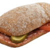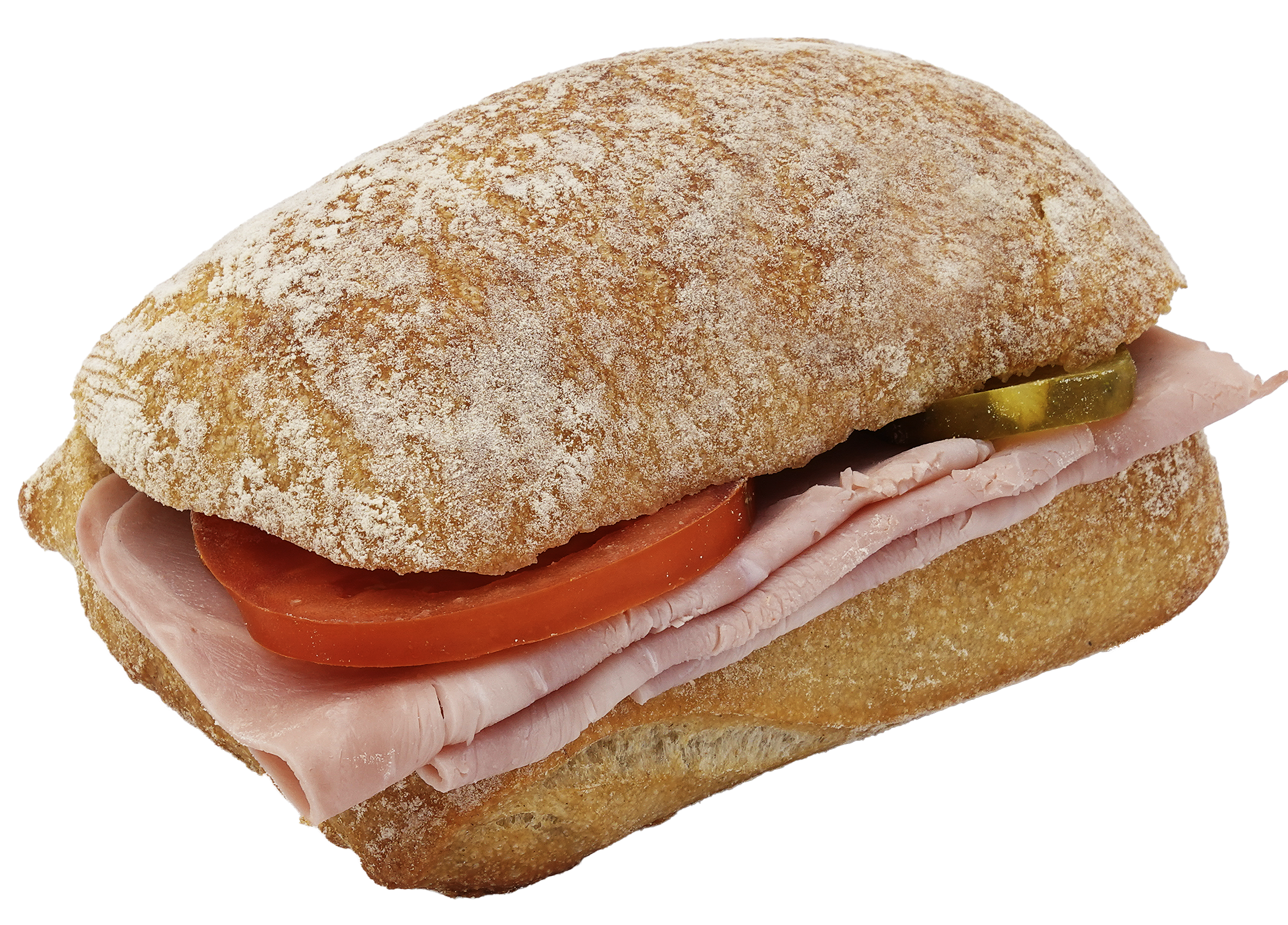 Helles Tournettebrötli aus Schweizer Mehl und 48 Stunden Teigruhe wird mit Schinken gefüllt. Garniert mit Gewürzgurke und Tomatenscheibe.