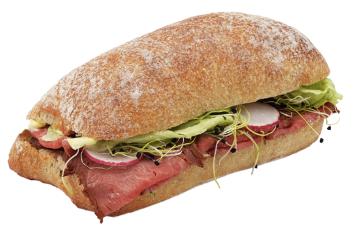 HALBWEISSMEHL (WEIZENMEHL, WEIZENGLUTEN, GERSTENMALZMEHL, Mehlbehandlungsmittel E300), Wasser, Roastbeef (Rindfleisch CH, Gewürze, jodiertes Kochsalz, Antioxidationsmittel E300, Aroma) (22.7 %), Mayonnaise (Sonnenblumenöl, EIGELB, Wasser, Tafelessig, SENF (Wasser, SENFKÖRNER, Speiseessig, Salz, Zucker, Dextrose, natürliche Aromen, Gewürz), Zucker, Salz), Eisbergsalat, Radiesli, WEIZENMEHL, EIER gekocht CH, Zwiebelsprossen, Gewürzgurken (SULFITE), Bio ROGGENKÖRNER, Alpensalz, Zwiebeln, GERSTENMALZ, Kapern, Hefe, Petersilie, Zitronensaft, WEIZENGLUTEN, Verdickungsmittel (E410, E466)