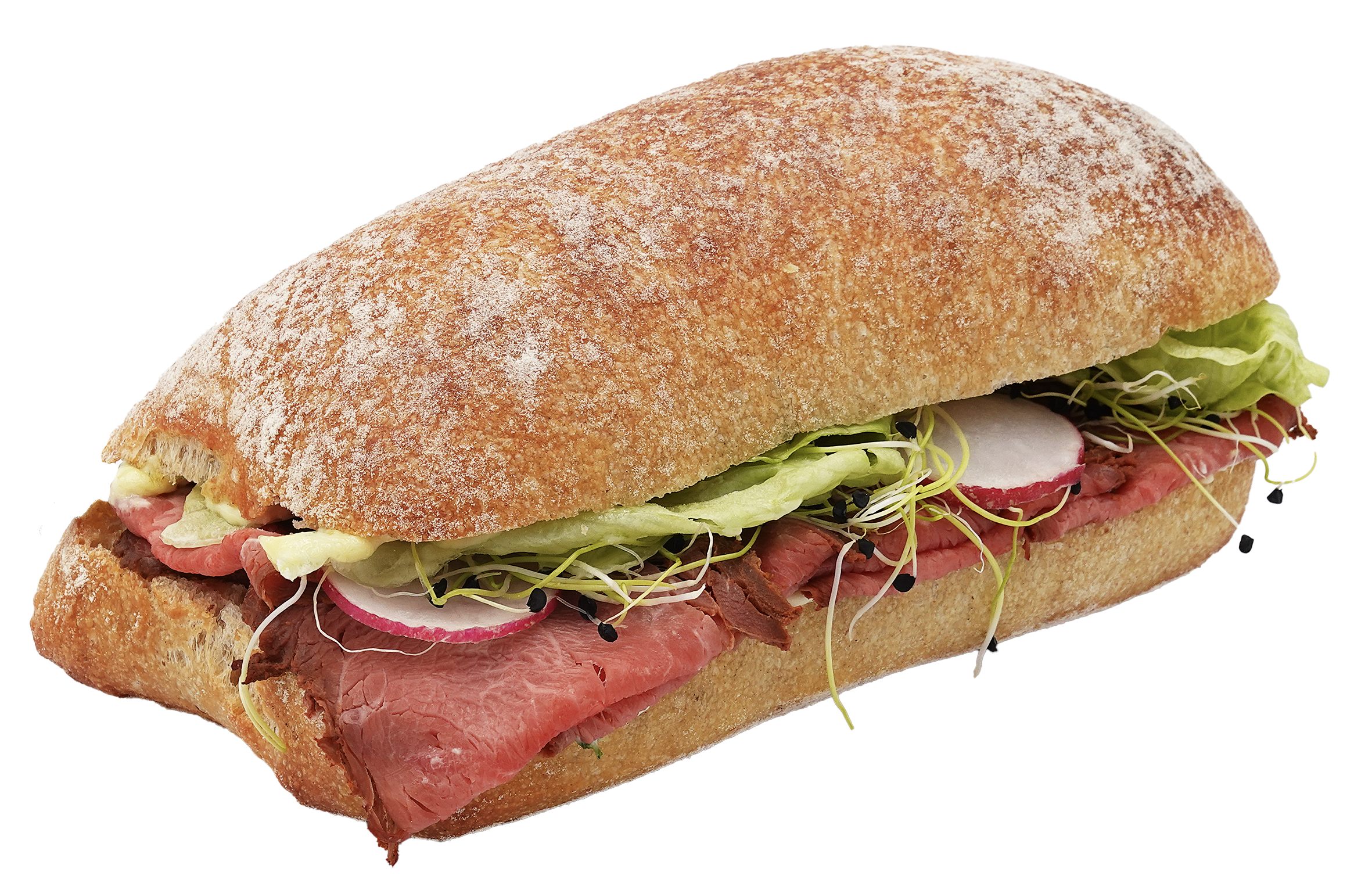 Helles Tournettebrötli aus Schweizer Mehl und 48 Stunden Teigruhe. Gefüllt mit zartem Roastbeef (CH) und hausgemachter Tartarsauce, garniert mit Eisbergsalat, Radieschen und Zwiebelsprossen.