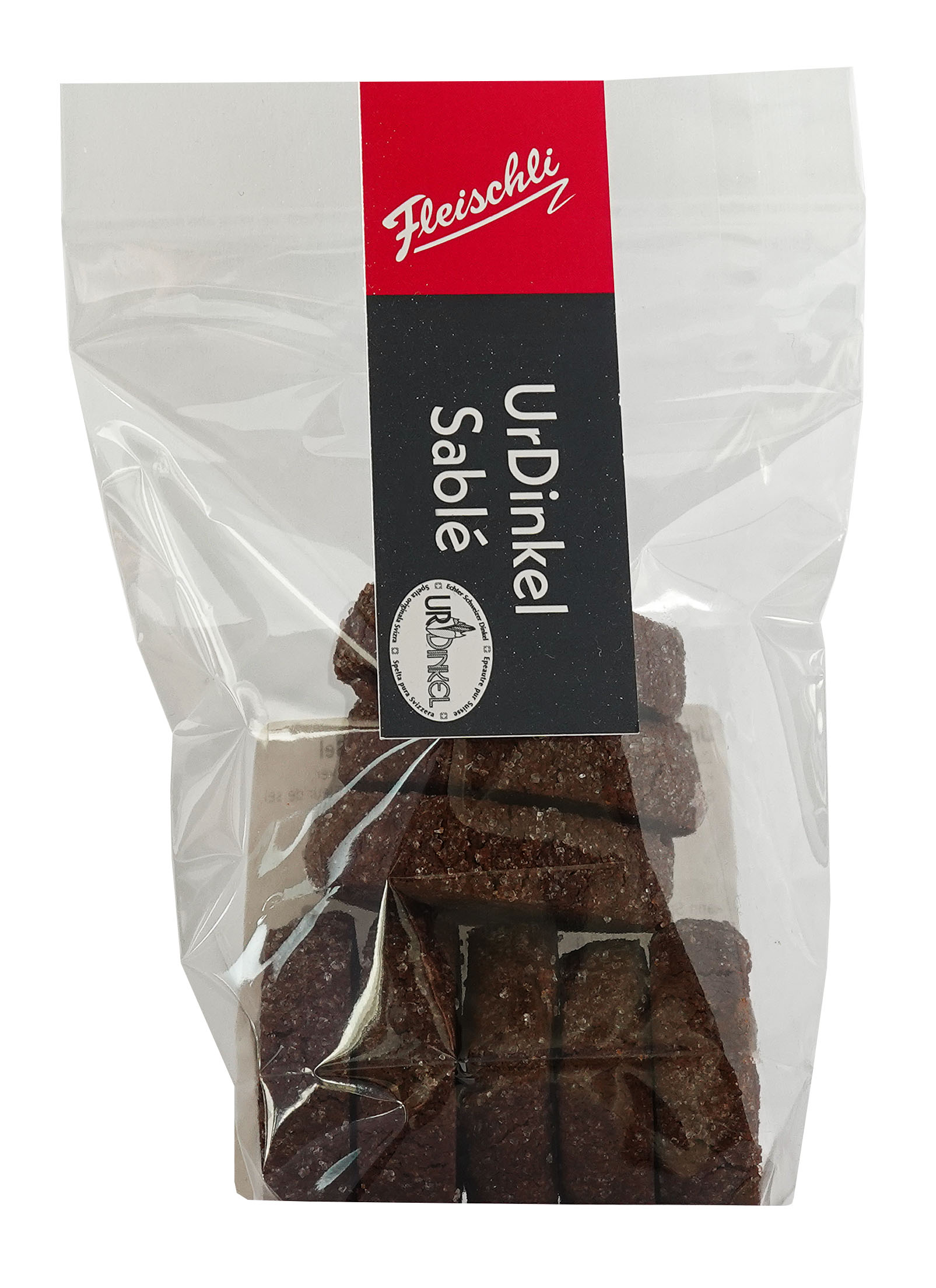 URDINKELMEHL (34.4 %), BUTTER CH, Rohrzucker, Kakaopulver (7.7 %), Zucker, Fleur de sel, Vanillearoma (enthält Ethanol), Backtriebmittel (E341, E450, E500)