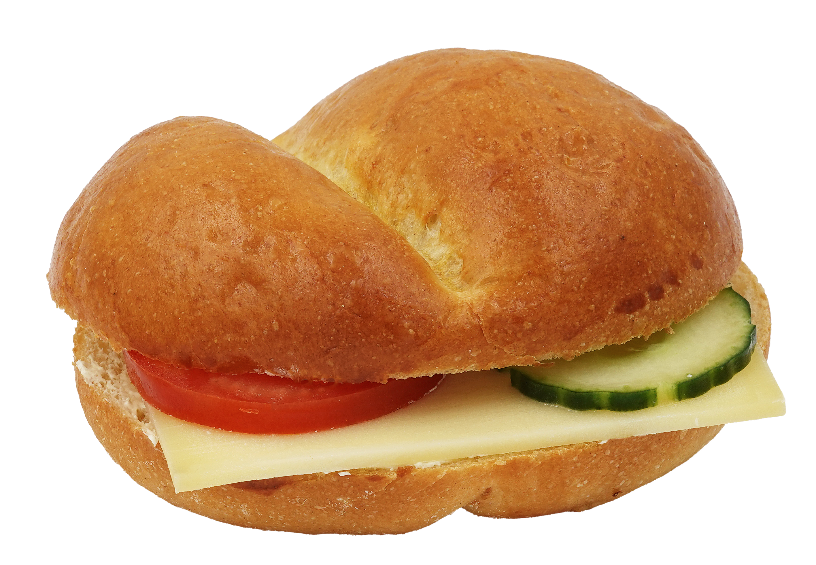 Weggli gefüllt mit Gruyère-Käse (CH) und garniert mit einer Salatgurken- und Tomatenscheibe.