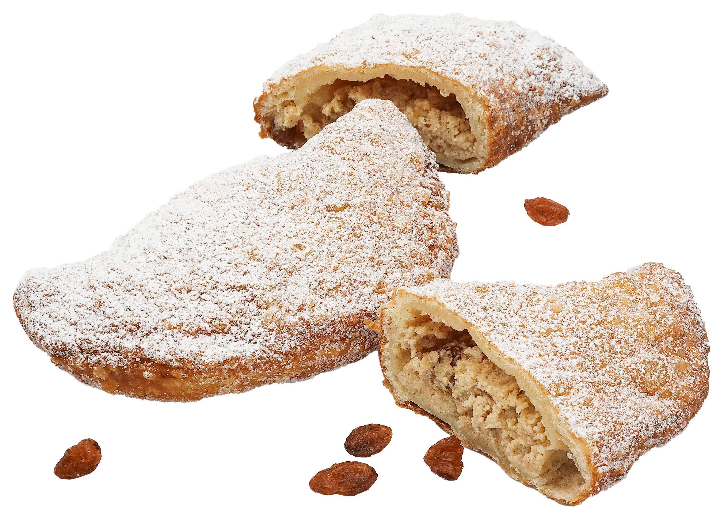 Luftiges frittiertes Gebäck mit feiner Quarkfüllung, die mit Sultaninen und Kirsch verfeinert wird.